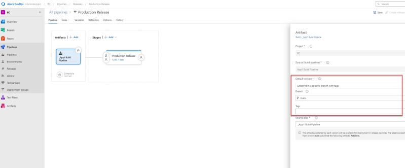 and specify artifact for main branch(or branch which you are using for Production environment)