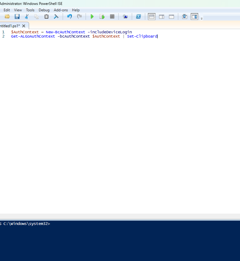 $AuthContext = New-BcAuthContext -includeDeviceLogin Get-ALGoAuthContext -bcAuthContext $AuthContext | Set-Clipboard