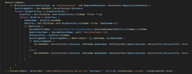 } | ForEach-Object { Write-Host "`n##[command]Installing Add-ins for" $instance ": $([int]$_.TotalSeconds) seconds" -ForegroundColor Green }